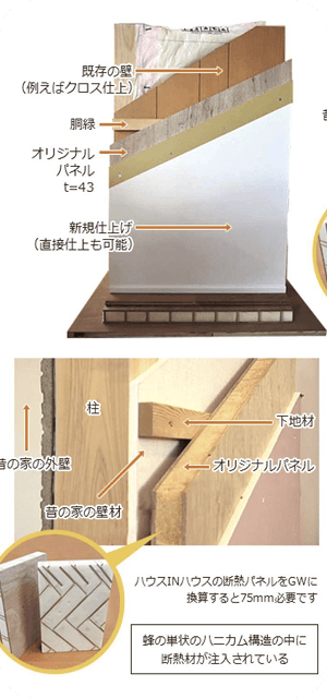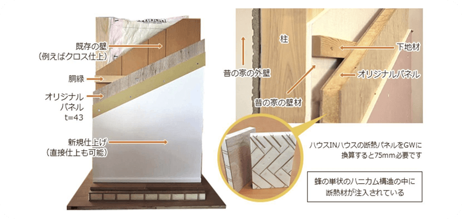蜂の巣状(ハニカム構造)の断面に断熱材を注入し、合板ではさんだぬくもリノベ「ハウスinハウス」のオリジナルパネル。 今ある家の壁・床・天井に貼り付けるだけで、耐久性のある壁と断熱材の両方を一度に施工できるようにしました。