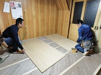 室内・水まわりの断熱工事。オリジナルパネルを既存の天井・壁・床の内側に隙間なく貼り付けていきます。