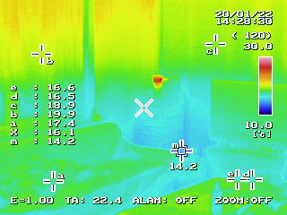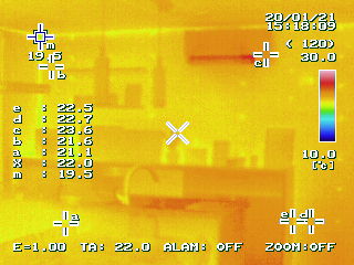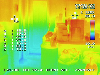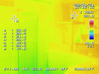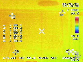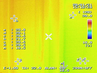 公平を期すため、サーモグラフィーの設定を同じ(上限30℃下限10℃)にし、外気温がほぼ同じ時間帯でハウスINハウスショールームの内部を見てみます。