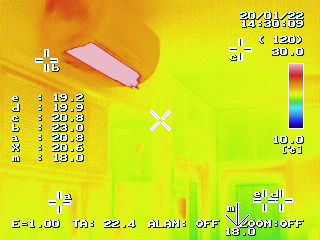 エアコンの温度設定23℃のダイニングをサーモグラフィーで見てみると、エアコンの吹き出し口付近こそ23℃ですが、廊下に面したドアの隙間などは12.7℃と、10℃以上の温度差があります。 体感的にはうすら寒いです(泣)